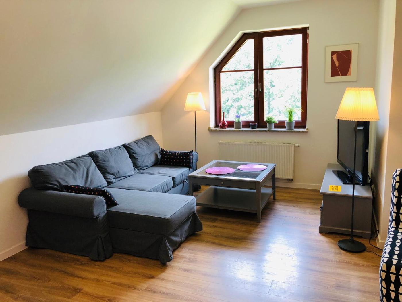 Apartament typu studio. Featuring a private entrance, this apartment is comprised of 1 living room, 1 separate bedroom and 1 bathroom with a walk-in shower and a hairdryer. In the well-equipped kitchen, guests will find a stovetop, a refrigerator, a dishwasher and kitchenware. Boasting a balcony with garden views, this apartment also offers a seating area and a flat-screen TV. The unit offers 3 beds. Apartament - 5 osobowy. Powierzchnia pokoju ok.: 40 mkw.